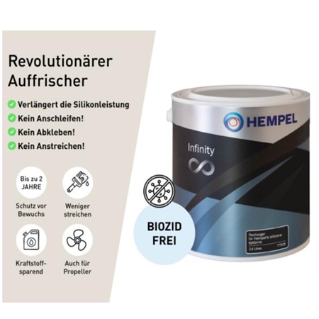 HEMPEL’s INFINITY ist ein einzigartiger Auffrischer auf Wasserbasis, der die Silikonleistung von HEMPEL’s SILIC ONE und HEMPASIL PRO Fouling Release um eine zusätzliche Saison verlängert. Neben der einfachen Applikation spart die Anwendung von INFINITY gleichzeitig Kosten und sorgt für weniger Farbverbrauch. Einfach auf die vorhandene Silikonbeschichtung auftragen, 24 Stunden trocknen lassen und im Anschluss abspülen. Schon kann die neue Saison auf dem Wasser beginnen.